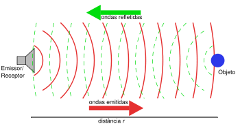 Esquema simplificado do sonar – O aparelho emite ultra-sons (em vermelho) que atingem o objeto (em azul), sendo refletidas sobre a forma de eco (em verde) e voltando ao aparelho receptor. Com base no tempo entre a emissão e a recepção, é calculada a distância (r)